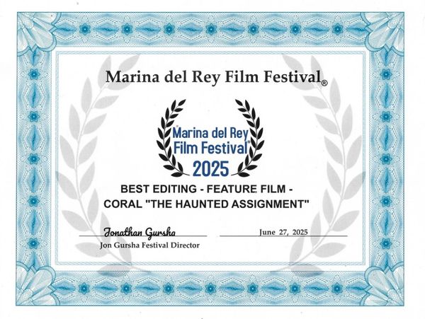 We are pleased to announce that "Coral: The Haunted Assignment" has been awarded Best Editing at the Marina Del Rey Film Festival. This recognition acknowledges the dedication and skill of our editing team in shaping a compelling and engaging narrative.